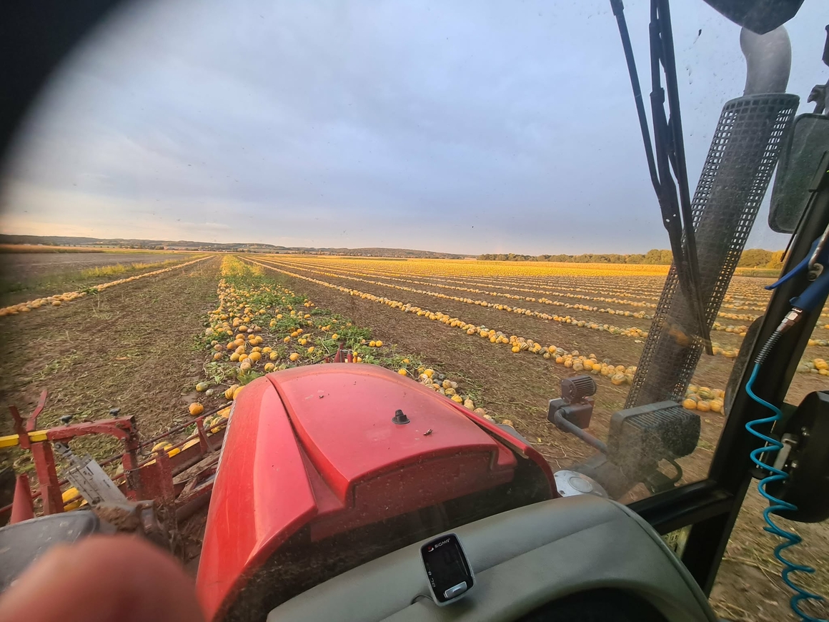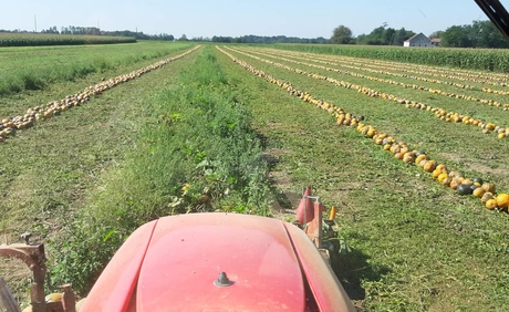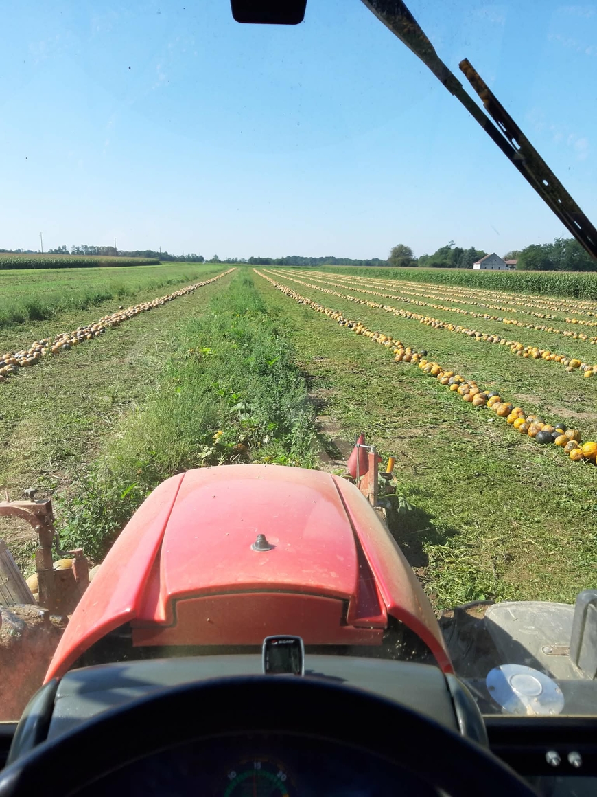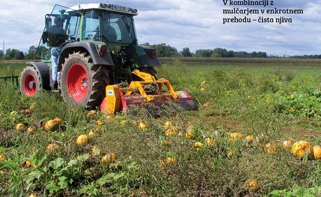 Sa plugom za bundeve, zguramo bundeve, u liniju i odstranimo bilje, a takođe i očistimo njivu od trava. Plug je sastavljen iz dva vrtljiva valjka, jedan-prednji ima hidromotorni pogon, koji kotrlja bundeve ispred sebe, očisti bilje i transportuje bundeve u liniju. Drugi valjak pritisne ostatke lišća od bundeva ka zemlji. Sve zajedno priključeno je na prednji priključak traktora. Na zadnji priključak montiramo kvalitetan mulčer (npr.INO Brežice d.o.o. – tip EURO ili ELITE), koji stvara potpritisak, tako da digne ostatke i travu, a onda jih izmulči. Sa takvom kombinacijom postižemo manju upotrebu energije, što ujedno znači i manje zagađivanje sredine.